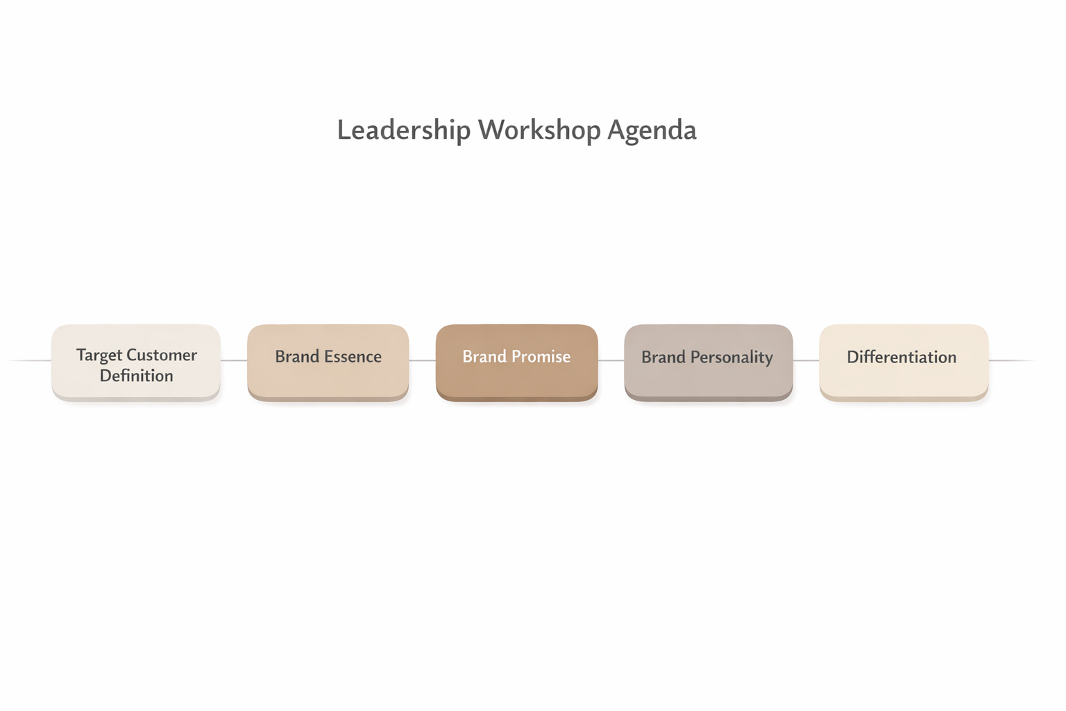 A structured leadership workshop agenda ensures that positioning decisions are made collaboratively, with clear outcomes for target customer definition, brand essence, promise, personality, and differentiation documented in a single session.